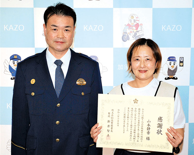 特殊詐欺被害を未然に防いだとして、加須署は、市内居住のパート山本静香さん(46)に感謝状を贈った。