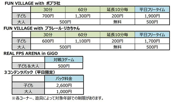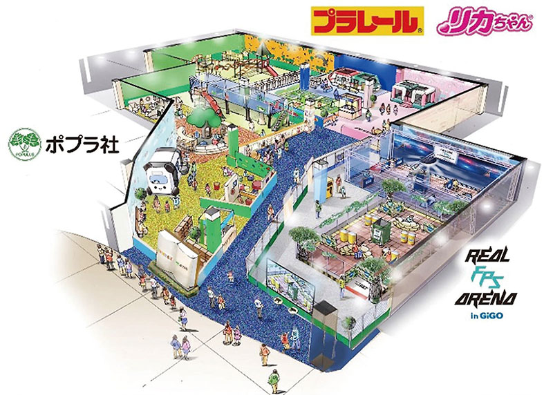 また、タカラトミーの玩具「プラレール」や「リカちゃん」の着せ替えなどが楽しめる「FUN VILLAGE with プラレール・リカちゃん」や赤外線レーザーガンによるシューティングゲーム(フィジカルeスポーツ)が楽しめる「リアルFPSアリーナ in GⅰGO」の三つのコンテンツエリアで構成されている。同社の増尾匡浩業態開発課長は「規模だけでなく国内初コンテンツの施設もあるので、隣接するゲームセンターと併せて幅広い世代の方が楽しめる空間にしたい」と自信を見せた。