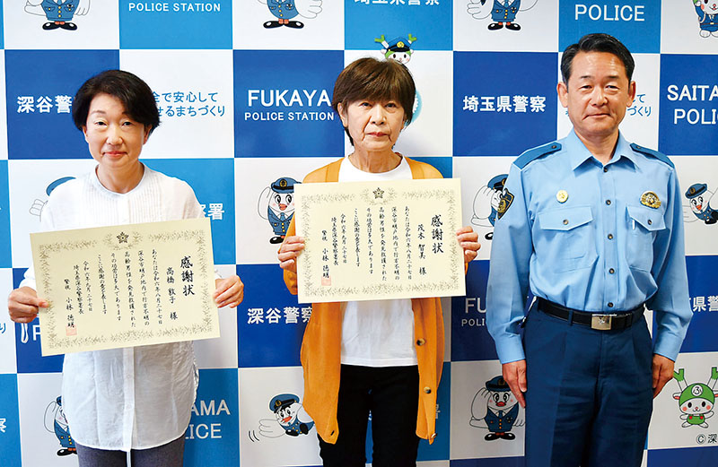 行方不明者の発見に貢献したとして深谷署は27日、いずれも深谷市在住の無職茂木智美さん(63)とパート高橋敦子さん(62)に感謝状を贈呈した。