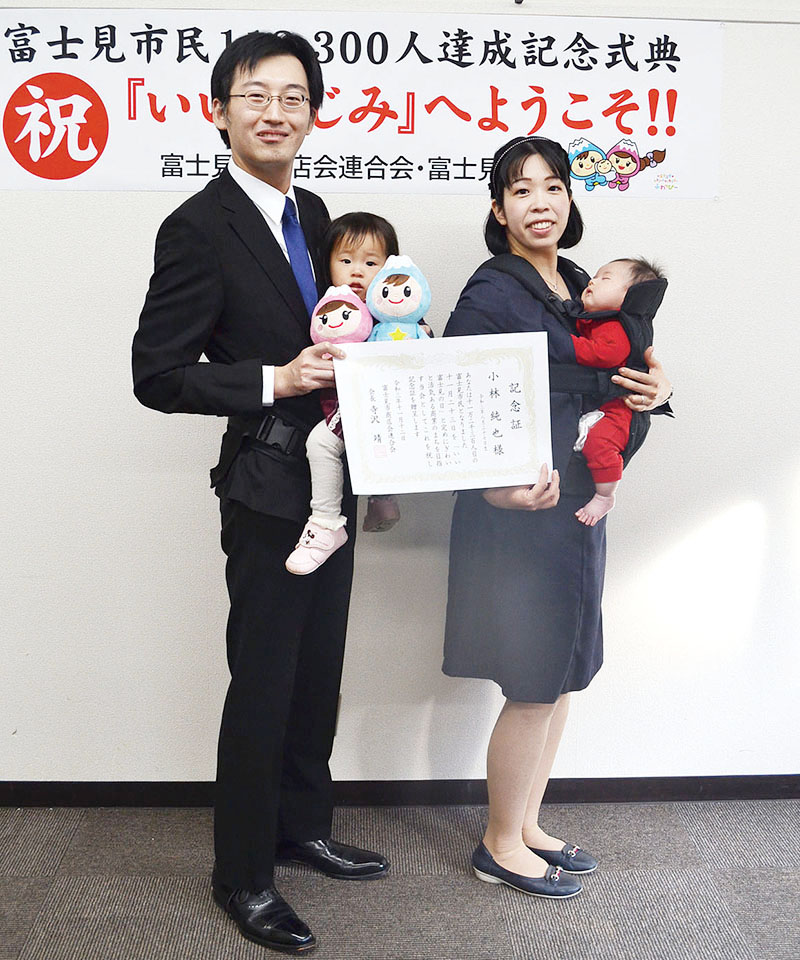 人口増加中の富士見市で11月23日は「いい富士見の日」に 11万2300人目に生まれた男児に記念品 2021/11/18/00:00 人口11万2300人目の市民として記念証などを授与された小林純也くんと純也くんを抱く母親の里奈さん(右)。左は長女の真弓さんを抱く父親の善滋さん=富士見市羽沢3丁目の市商工会 この写真の記事に戻る