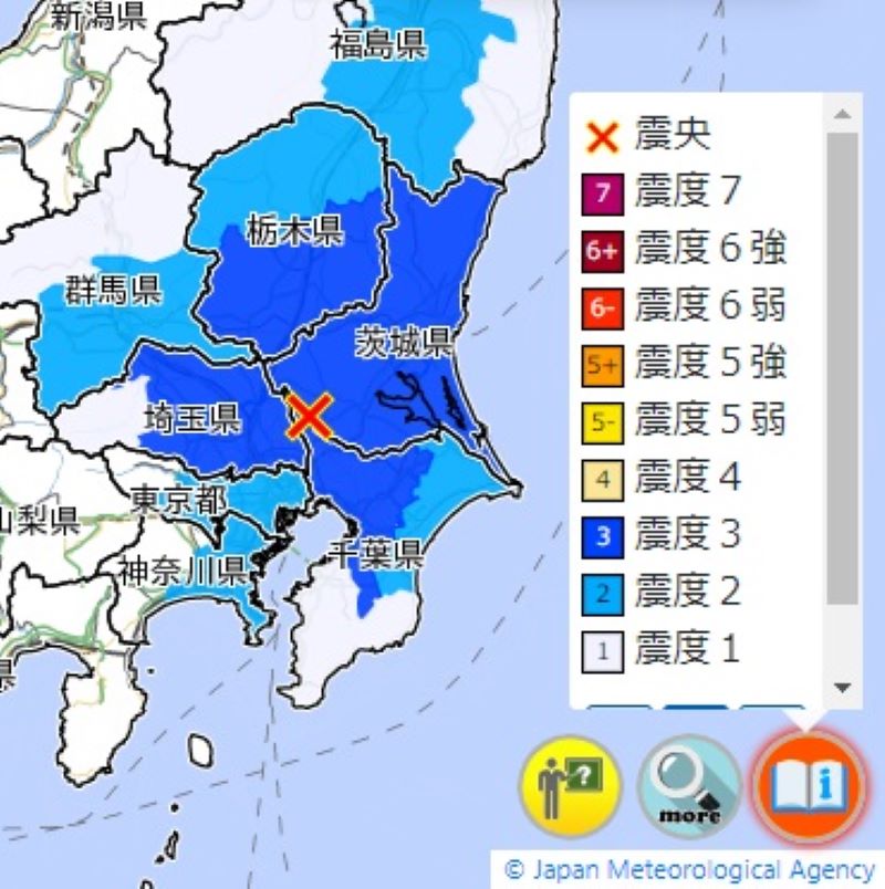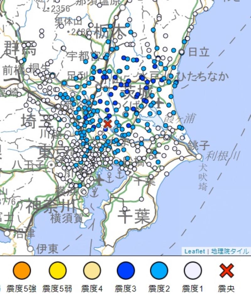 茨城県や埼玉県北部と南部などで震度3の地震を観測した。