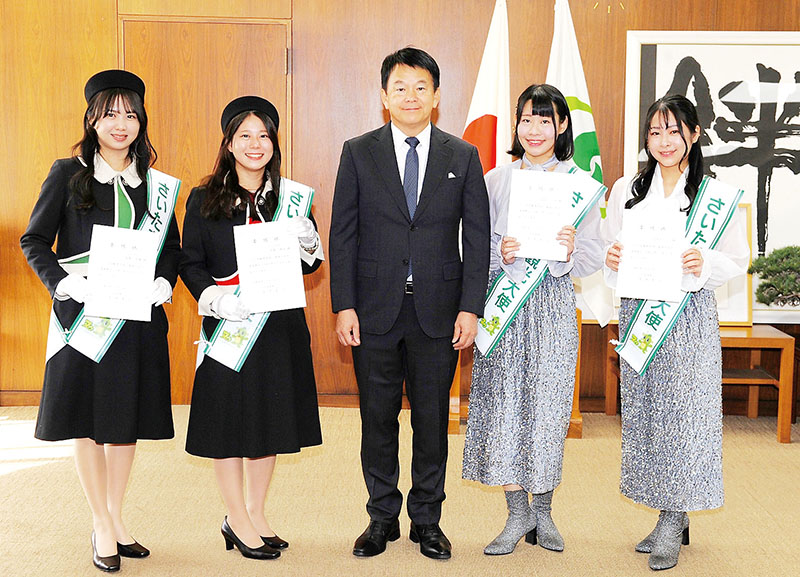 さいたま市の魅力を発信 17代目「さいたま小町」2人と音楽コンテスト「夢KANAオーディション」で18代目グランプリの2人が観光大使に 2024/11/09/12:12 清水勇人市長(中央)から委嘱状とたすきを受け取り、笑顔を見せる(左から)武田梨里さん、河森明依さん、若菜さきさん、はなちゃん=7日、さいたま市役所 この写真の記事に戻る