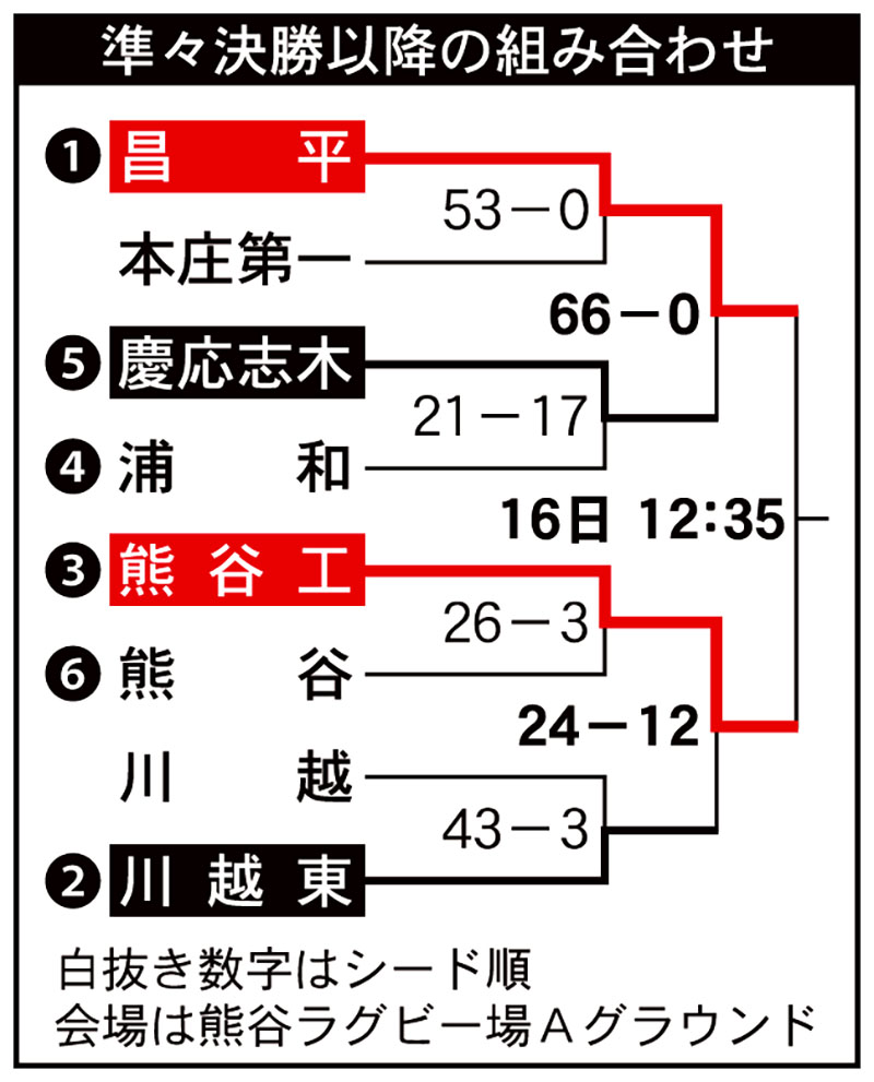 <高校ラグビー>熊谷工、14年ぶり決勝へ ハードワーク貫き、第2シード川越東に競り勝つ 雪辱に燃える“工業”「ターゲットは決勝」 2024/11/10/12:31 熊谷工―川越東 後半22分、熊谷工のフランカー伊藤(中央下)がモールから抜け出して追加点を奪う 全国高校ラグビー埼玉大会準々決勝以降の組み合わせ この写真の記事に戻る