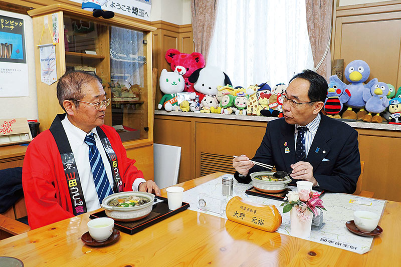 山田うどん、渋沢栄一が好んだ味を再現 「醤油仕立ての鍋焼き煮ぼうとう」 県と連携、観光周遊キャンペーンに合わせ新発売 知事が試食「優しい味がする」 新メニューの価格は 2024/11/16/14:30 試食する大野知事(右)と山田社長=15日午前11時ごろ、県庁 この写真の記事に戻る