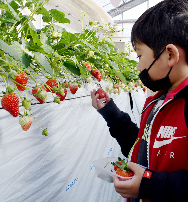 秩父市田村の市川いちご園では、県のオリジナル品種「あまりん」「かおりん」を中心に栽培。有機培土を使った高設土耕栽培で、腰をかがめずにイチゴ狩りを楽しめる。