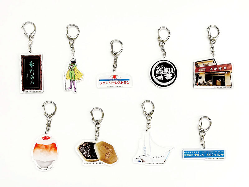 川越ガチャのラインアップは川越氷川神社の大鳥居にかかる「扁額(へんがく)」(勝海舟の書)、時の鐘をモチーフに生まれたヒーロー系キャラクター「時の鐘マン」のほか、「丸広百貨店のファミリーレストラン」「松本醤油(しょうゆ)店」「亀の最中」など川越の歴史を彩るお店など全8種類。レアアイテムは、川越の隠れた名所になっていた「カトゥ ジドゥシャ」の看板。設置場所は、丸広百貨店川越店、アトレ川越など。