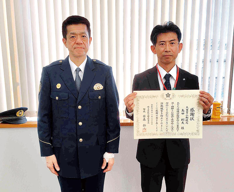 ATMと窓口の間を何度も行き来…「息子のために緊急でお金が」と話す女性 郵便局長が詐欺を疑い、警察へ通報 被害を未然に防ぎ感謝状 2024/12/02/09:04 笹森幹人署長(左)から感謝状を受け取った島田則夫局長=熊谷市冑山の大里冑山郵便局(熊谷署提供) この写真の記事に戻る