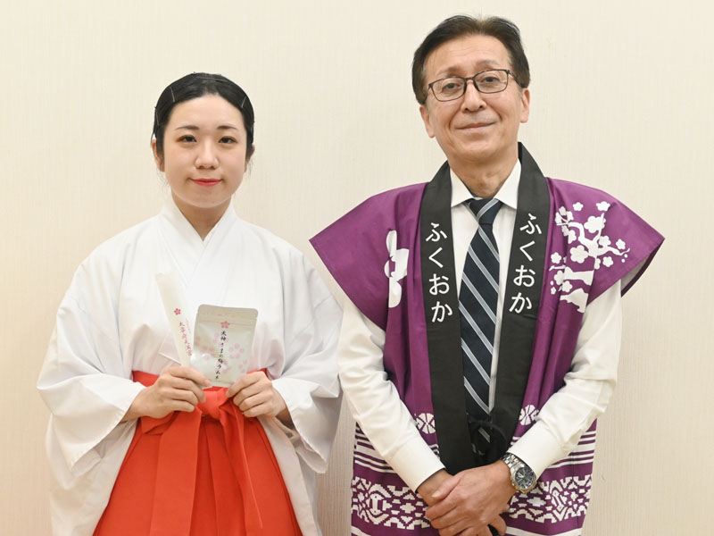 まるひろ川越店で4日から開かれる「福岡物産展」をアピールしようと、丸広百貨店の担当者と太宰府天満宮の巫女(みこ)らが3日、さいたま市北区の埼玉新聞社を訪れた。