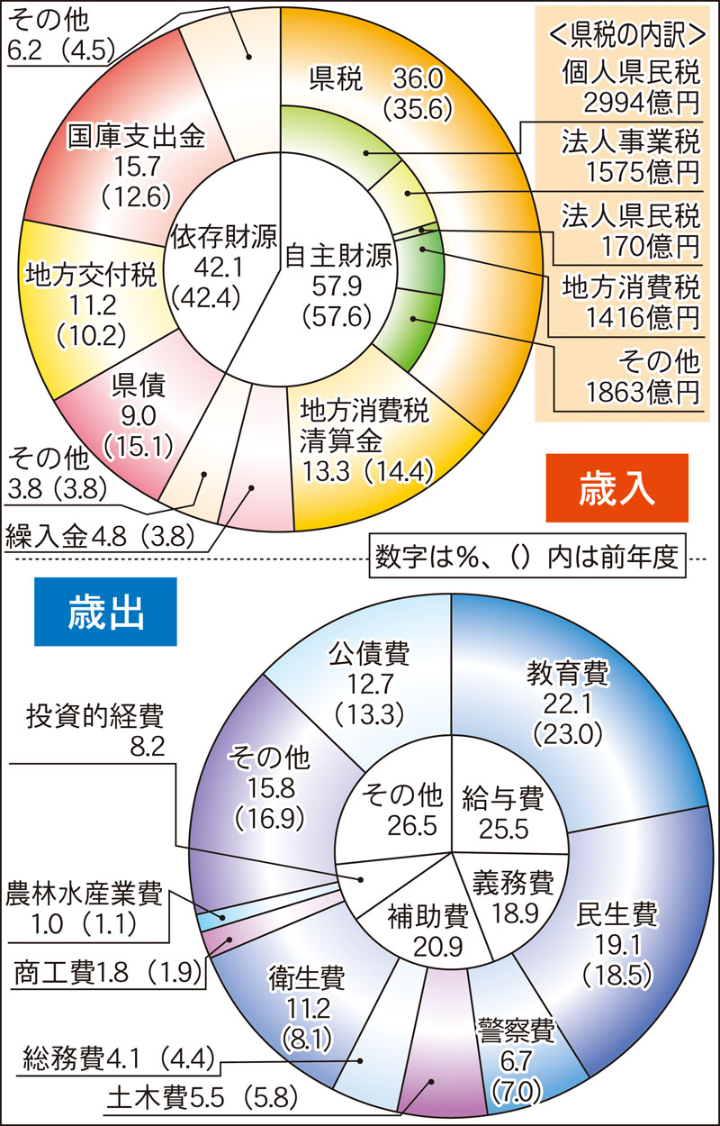 歳入の柱となる県税収入は新型コロナ感染拡大の影響により、法人2税(法人事業税、法人県民税)をはじめ多くの税目で減収が見込まれた本年度比6・2%(467億円)増の8018億円。地方交付税は同15%増の2492億円、国庫支出金は同31・1%増の3505億円と試算。