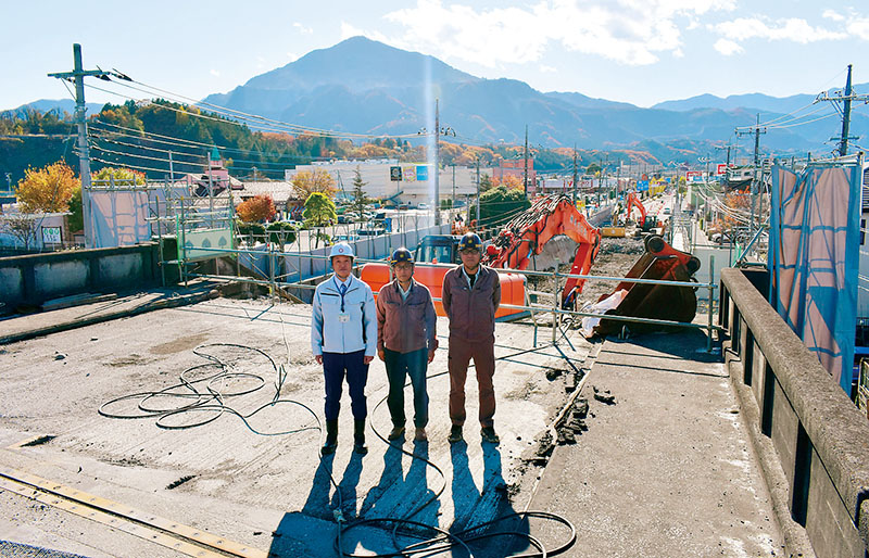 平面化工事が進む秩父陸橋を紹介する(左から)県秩父県土整備事務所の辻幸二所長、山口組の新井久夫取締役、新井公裕工事部長=11月29日、秩父市