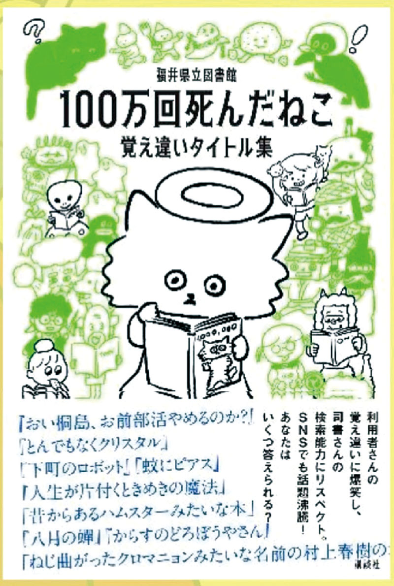「埼玉県の高校図書館司書が選んだイチオシ本2021」が18日、発表された。本の専門家が高校生たちに多くの本を読んでもらいたいと、投票して選んだベストテン。1位に決まったのは、「100万回死んだねこ 覚え違いタイトル集」(福井県立図書館著・編集、講談社)で、司書の仕事や図書館の楽しさを伝える内容になっている。