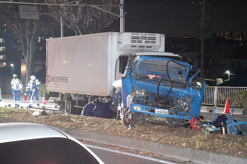車に挟まれていた…男性2人死亡、トラックが突っ込み巻き添え 近くで2人が作業中、トラック3台が次々大破 挟まれた車体も大きくつぶれ無残 会社員とバイトの2人、身元判明した
