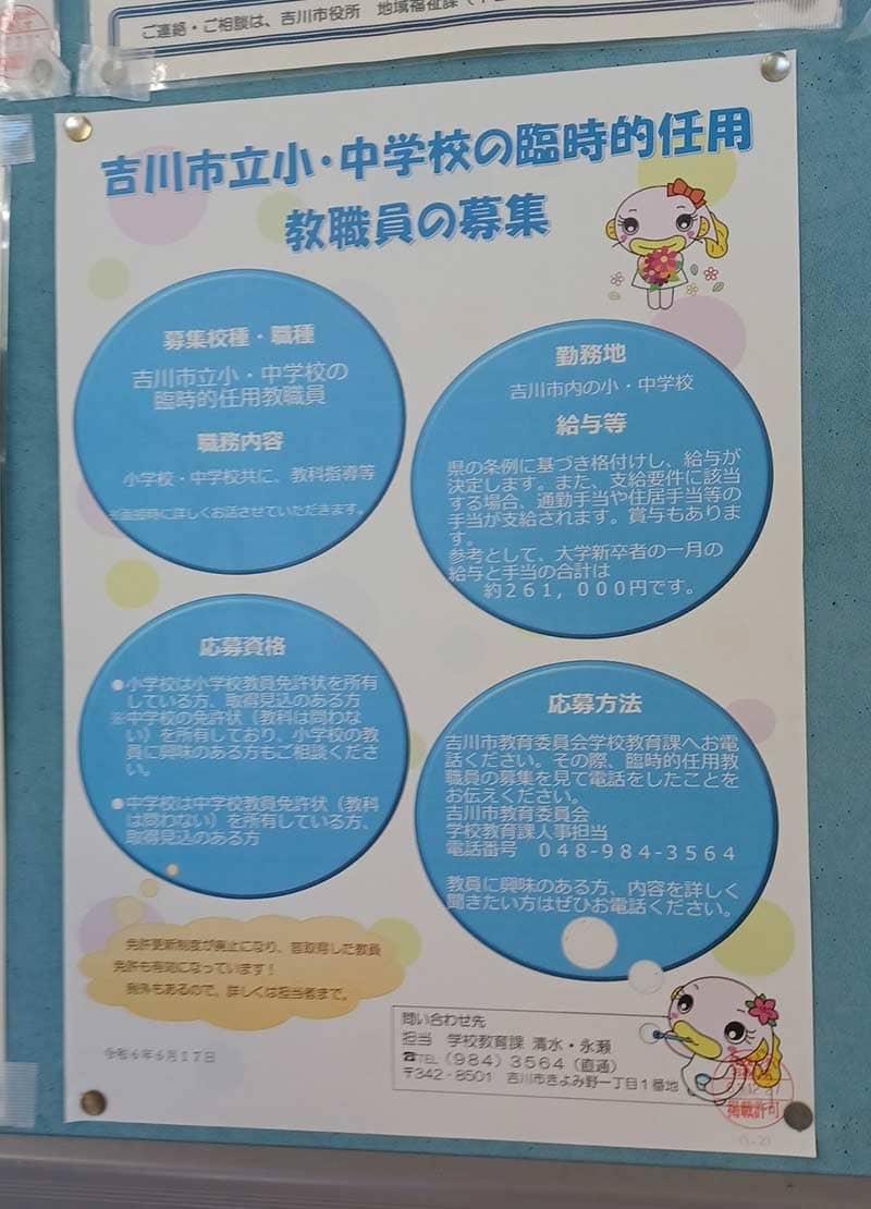 教員不足でテストできず…2週間にわたり自習続く 生徒に直接的影響 埼玉・吉川 教員の出産、育児、病気、退職が重なり、市立小中学校では6~7人の欠員 補充追い付かず 11月以降、教員2人が補充され、授業は正常に 2024/12/15/10:17 吉川市役所=吉川市きよみ野 教員不足を受け、吉川市教委は市内の駅や公共施設に臨時的任用教職員を募集するポスターを貼るなど対応に追われている この写真の記事に戻る