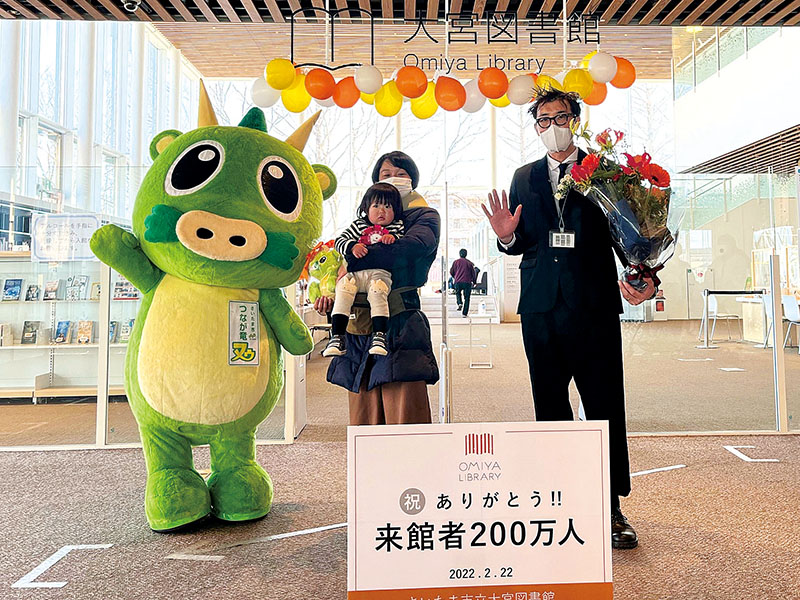 さいたま市立大宮図書館(大宮区吉敷町)の来館者が2月22日、開館から2年10カ月で入館者200万人を達成した。200万人目の来館者は市内在住の親子で、記念品として市PRキャラクター「つなが竜ヌゥ」の縫いぐるみと花が贈呈された。
