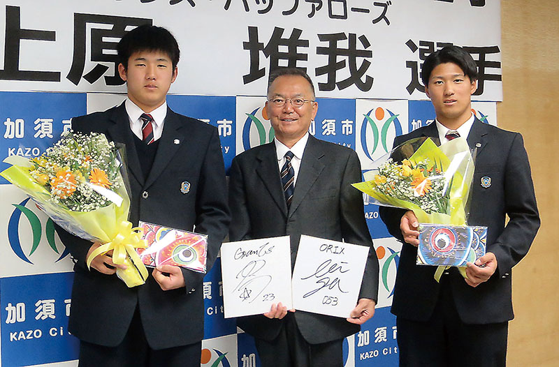 巨人から1位指名・石塚内野手 オリックスから育成3位指名・上原投手 花咲徳栄高校の2選手が加須市長を表敬訪問 「記録と記憶に残る選手に」「支配下勝ち取り、日本一に」と意気込み 2024/12/27/08:52 角田守良市長(中央)を表敬訪問した石塚裕惺内野手(左)と上原堆我投手=加須市役所 この写真の記事に戻る