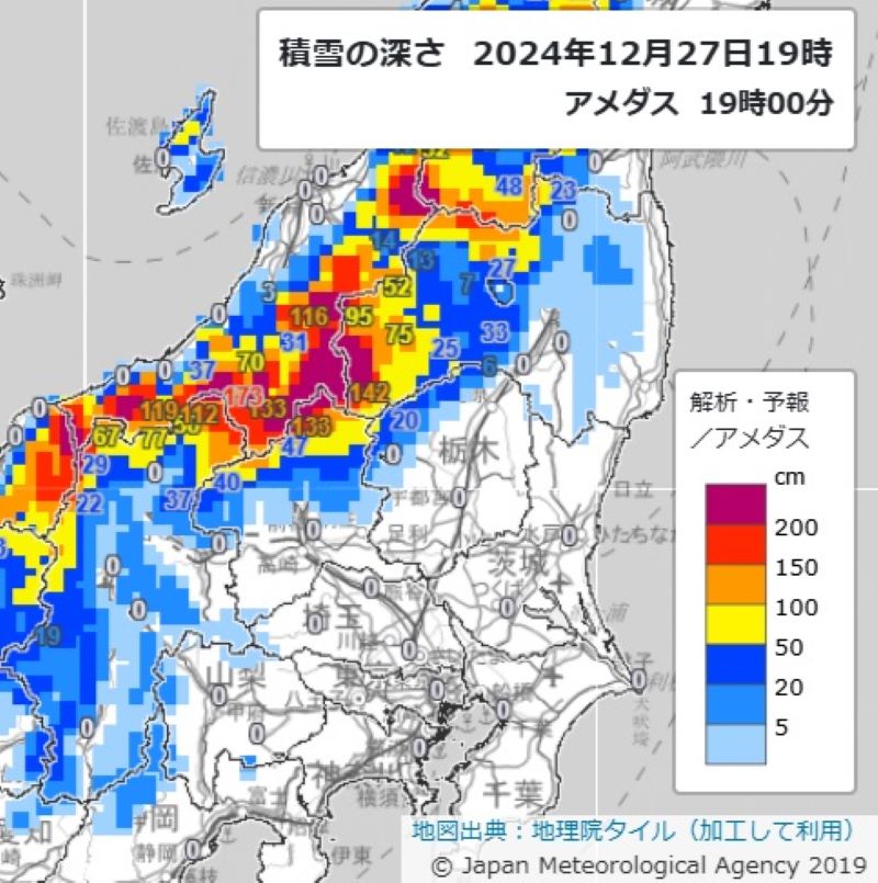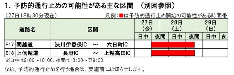 【速報】大雪で関越道など予防的通行止めの可能性 NEXCO東日本が発表 2024/12/27/20:00 予防的通行止めを行う可能性がある区間と時間帯(NEXCO東日本発表資料から) 積雪の深さ(27日午後7時アメダス、気象庁かHPから) この写真の記事に戻る