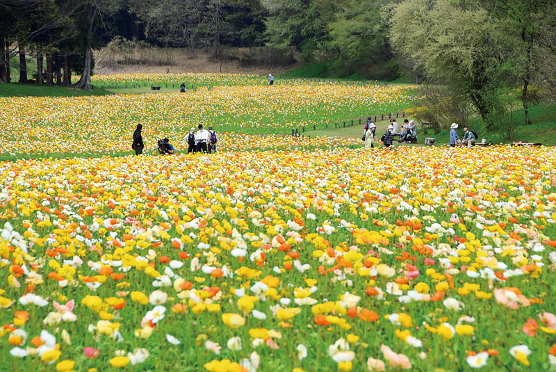 アイスランドポピーの和名はシベリアヒナゲシ。花畑は約8千平方メートル。約70万本のオレンジ、黄、白色の鮮やかな花が咲き誇り、カメラや携帯で撮影する人たちの姿が見られた。散策路を巡る人たちは穏やかな表情で、つかの間“コロナストレス”を忘れ、春の息吹を満喫しているようだった。