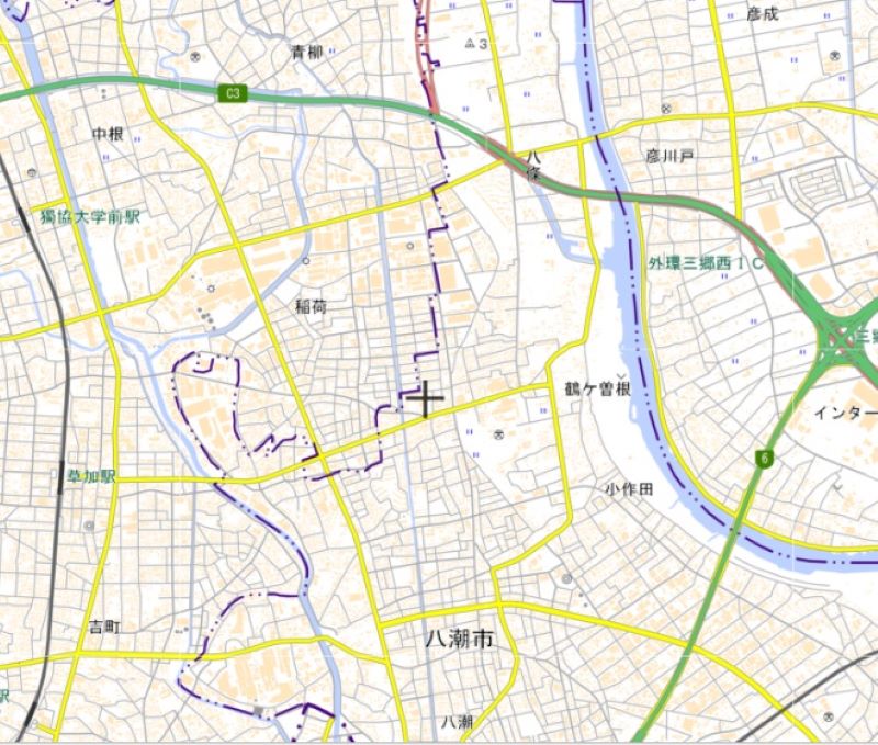「生鮮市場TOP!八潮伊草店」の位置。図の中心点付近(国土地理院HPから)