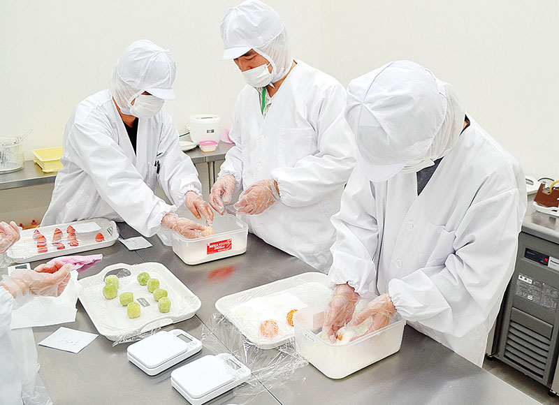 イオンタウンふじみ野に限定「フルーツ大福」 一つ一つに思い 1階「スイーツ・スイーツ」コーナーで販売 2022/04/25/00:00 凛々堂の和菓子「フルーツ大福」(凛々堂のホームページからダウンロード) 障害者の就労継続支援B型事業所「リハスワークふじみ野」で、支援員(左)の指導を受けながら和菓子「フルーツ大福」を作る利用者の男性2人=ふじみ野市福岡2丁目 この写真の記事に戻る