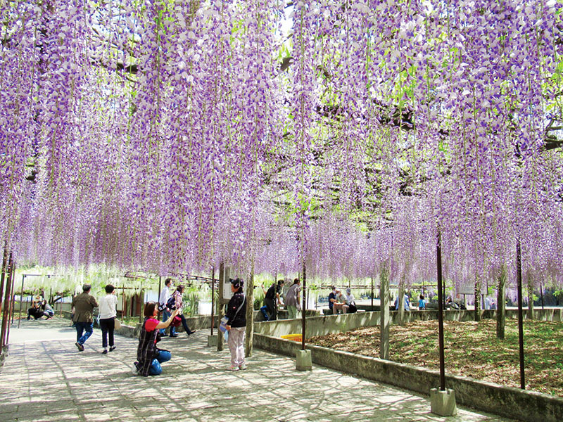 藤棚は2500平方メートルと壮大。本堂前の左右二つの棚が骨波田の藤で、広く張り出した枝から薄紫色の花を付けた花房はカーテンのよう。咲きながら伸びる花房の下の部分は4日現在、つぼみを付けていた。長いものでは1.5メートルになるものもある。背の高い人は腰をかがめながら楽しんでいた。