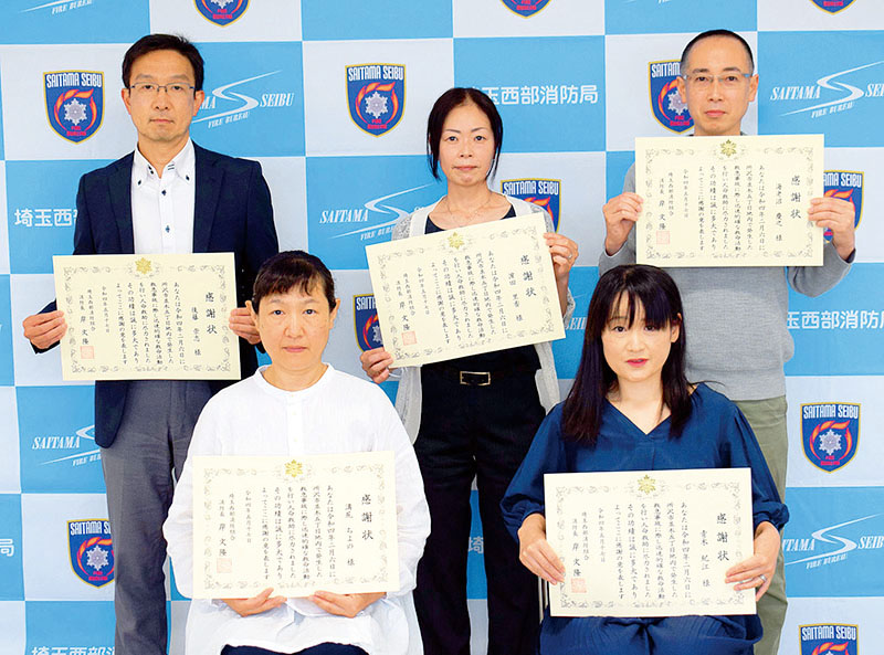 バスケットボールの試合中に倒れた女子児童の救助に貢献したとして埼玉西部消防局は17日、所沢市在住の看護師青木紀江さん(45)ら5人に感謝状を贈呈した。感謝状を受けたのは、青木さんのほか、溝尻ちよのさん(50)、後藤崇志さん(49)、海老沼慶之さん(48)、浜田里香さん(47)=いずれも市内在住=の合計5人。とっさの判断と連携プレーで女児の命を救った。