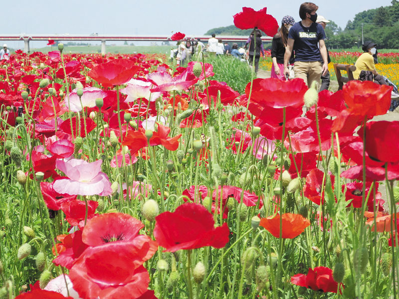 鴻巣市滝馬室の荒川河川敷にある「ポピー・ハッピースクエア」のポピーが満開を迎えている。花畑の広さは約12・5ヘクタールで日本一を誇る。約3千万本のポピーは赤やピンクがひときわ鮮やか。訪れる人を楽しませている。