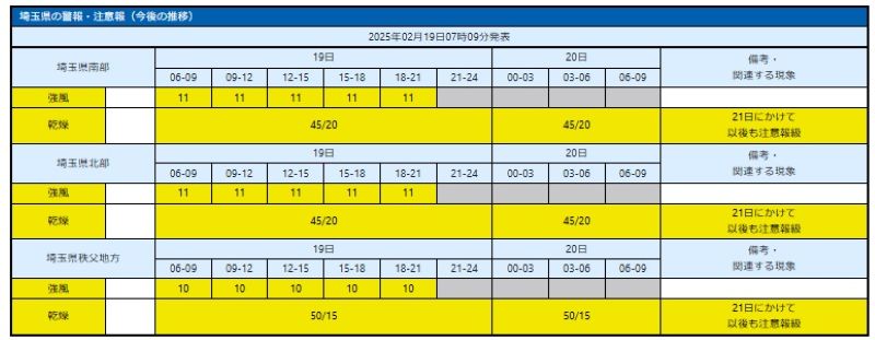 【速報】埼玉に強風注意報 さいたま市で最大瞬間風速14・7メートル観測 2025/02/19/11:17 19日に予想される強風の程度(メートル毎秒)と時間帯。乾燥の程度(実効湿度/最少湿度%)=気象庁HPから この写真の記事に戻る