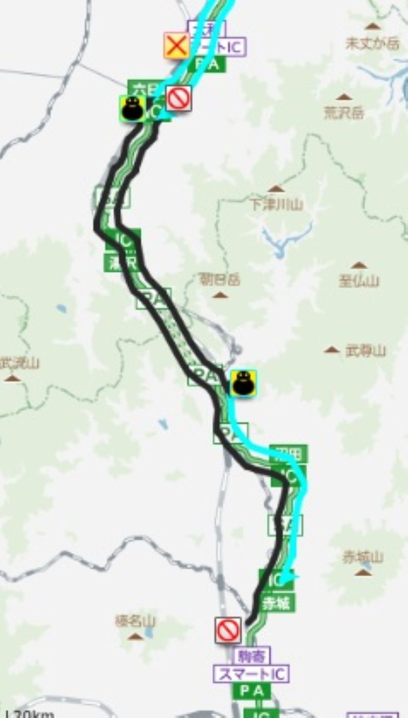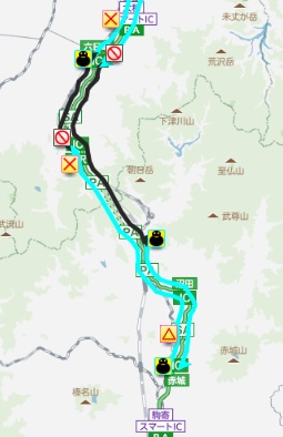 関越道の通行止め区間(黒線)が延長。下りは渋川伊香保ICから通行止めとなる(NEXCO東日本、ドライブトラフィックから)