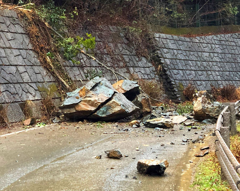 心配は的中する。19年3月、樹木が伐採され、むき出しになった斜面から、すぐ下を走る道路に巨石が崩落。同年10月には台風19号の大雨で大量の土砂が同じ道に流れ込んだ。幸運にも人的被害はなかったが、小杉のほか龍ケ谷、麦原地区へと通じる生活道路でもある。小杉に住む木下尊規さん(88)は「業者任せだから事故が起きた」と、手島さんらと共に町の対応を促す活動に取り組んだ。
