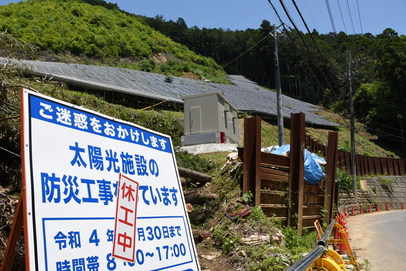 だが、問題は積み残されたままだ。小杉の計画地では応急的な復旧工事の後パネルが取り付けられ、昨年2月から発電出力750キロワットの施設が稼働。町は雨水貯留池建設や道路沿いに落石防止柵の整備などを指導しているが、実現していない。木下さんは「安全対策が終わる前に発電が始まるなんておかしい。危険な場所に造られていても、業者が手を付けたら止める方法がないのが現実」と嘆く。