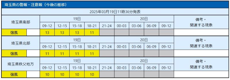 埼玉で強風に警戒 県内全域に注意報発表【速報】 2025/03/19/12:17 速報 鉄道・交通 予想されている強風の程度(メートル毎秒)と時間帯=気象庁HPから 熊谷地方気象台は19日午前11時36分、埼玉県に強風注意報を発表。夜のはじめ頃まで強風に注意するよう呼び掛けている。 もっと読む ツイート シェア シェア 経済・社会の記事一覧 埼玉新聞のHOMEに戻る