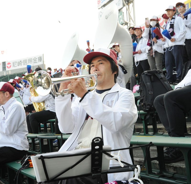 第97回選抜高校野球大会第8日の25日、埼玉県代表で春夏通じて甲子園初出場の浦和実業学園高校は東海大学付属札幌高校を8―2で制し、8強入りした。同日は、全国屈指の実力を持つ同校チアダンス部が全国大会出場のため不在。一塁側アルプススタンドでは、チアに代わり、ブラスバンド部が輝きを放った。その中に、約30年間追い続けた夢をかなえた人がいた。野球の応援に魅了され楽器の道に進んだ同校OBの会社員山崎洋司さん(46)。積年の思いを込め、球場にトランペットの音を高らかに響かせた。