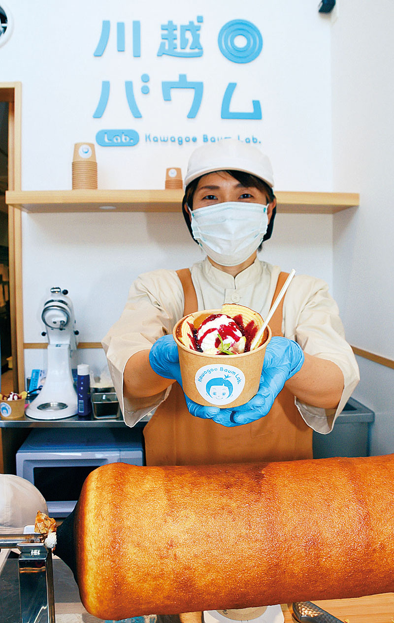 老舗しょうゆ蔵の笛木醤油(本社・川島町)は22日、川越市の蔵造りの街並み近くの幸町に焼きたてバウムクーヘンを提供する新店舗「川越バウムLab.(ラボ)」をオープンする。開店を控えた20日は内覧会が行われ、新築されたばかりの店やメニューなどがお披露目された。