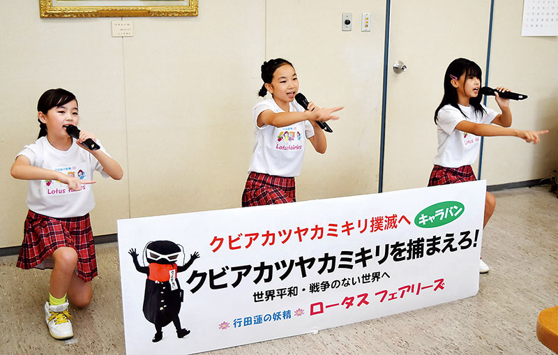 行田市を中心に活動するご当地アイドルグループ「行田蓮の妖精ロータスフェアリーズ」は5日、熊谷市役所に小林哲也市長を表敬訪問し、サクラなどを枯らす特定外来生物「クビアカツヤカミキリ」の被害拡大防止を訴えるオリジナルソングを披露した。
