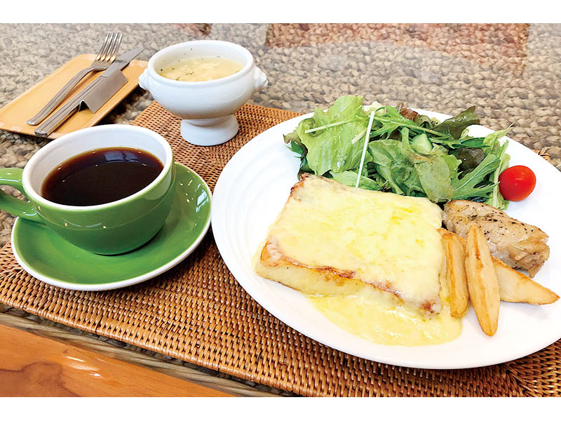 同店の看板メニューは「とろ~りチーズのフレンチトースト」(スープとドリンク付きで税込み1300円)。とろっと溶けたたっぷりのチーズとフレンチトーストのやさしい小麦の甘さが口の中で絡み合う。付け合わせには季節の旬野菜とフライドポテト、さらにチキンまたはシーフードも付いてボリュームも満点の一品だ。
