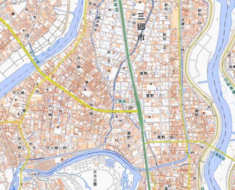 停電が発生している三郷市鷹野、戸ケ崎地区周辺(国土地理院HPから)