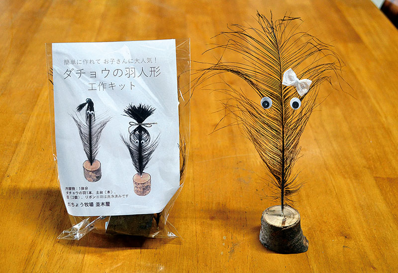 無料でダチョウやエミューなどと触れ合える新座市池田の「だちょう牧場・並木屋」で、木の枝の土台にダチョウの羽根をペン立てのように挿した工作キット「ダチョウの羽人形」(税込み500円)の販売を始めた。ダチョウの卵を材料にしたパンを製造していた業者がコロナ禍で閉店。販売できなくなったことを受けて、考案した。