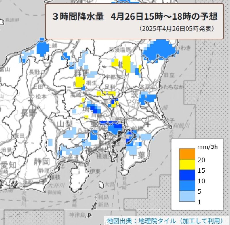 【速報】埼玉で竜巻などの激しい突風、急な強い雨、落雷に注意 昼過ぎから 上空に氷点下27度以下の強い寒気 降ひょうの恐れも 2025/04/26/08:47 雷注意報の出ているエリア(26日、気象庁HPから) 3時間降水量予想図(26日午後3時から午後6時、気象庁HPから) この写真の記事に戻る