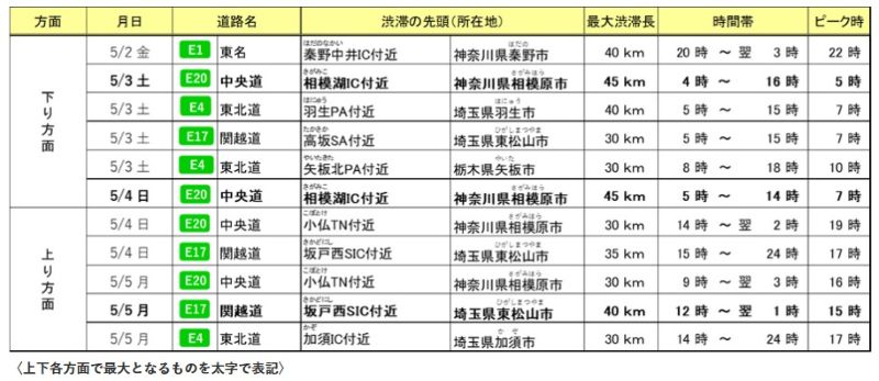 GW中の特に長い渋滞の予想(NEXCO東日本などの発表資料から)