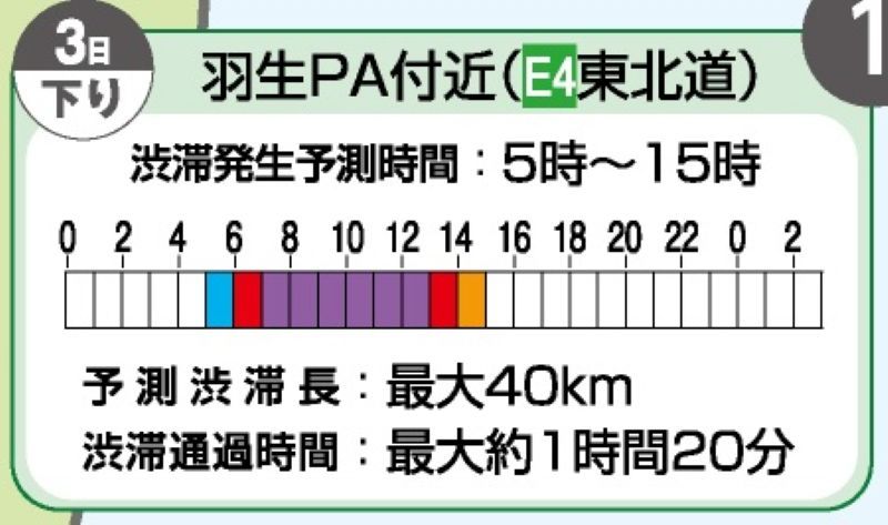 3日、東北道下りの渋滞予想(紫が30キロ以上、赤が20キロ以上、黄色が10キロ以上の渋滞予測)=NEXCO東日本発表資料