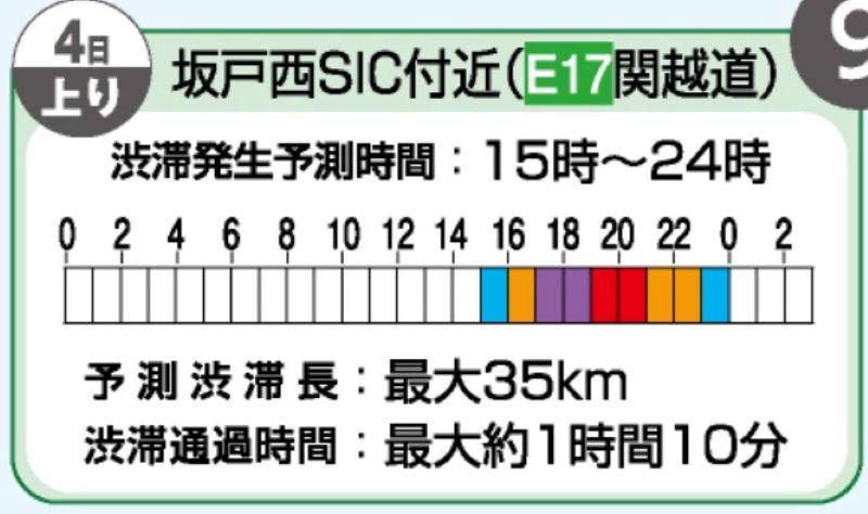 4日、関越道上りの渋滞予想(紫が30キロ以上、赤が20キロ以上、黄色が10キロ以上の渋滞予測)=NEXCO東日本発表資料