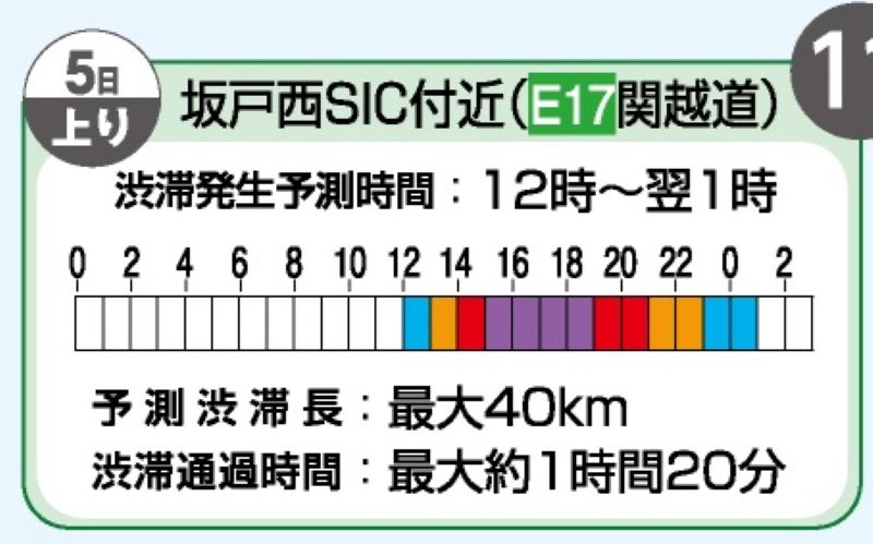 5日、関越上りの渋滞予想(紫が30キロ以上、赤が20キロ以上、黄色が10キロ以上の渋滞予測)=NEXCO東日本発表資料