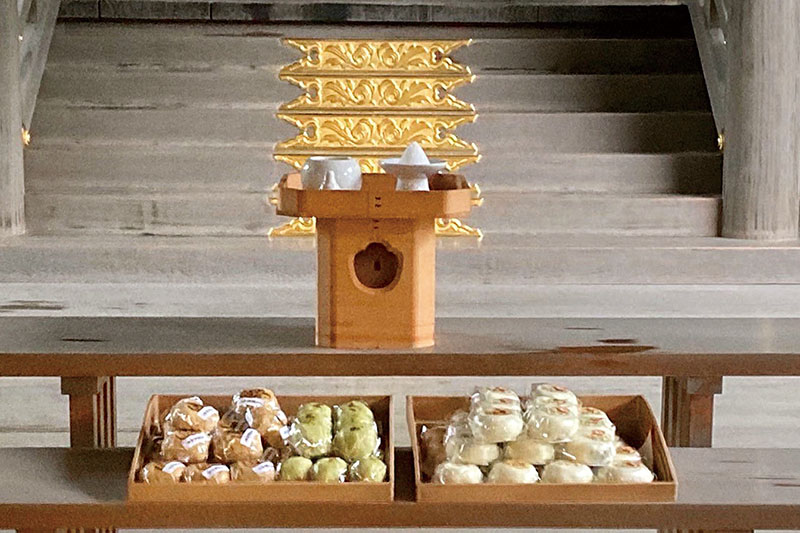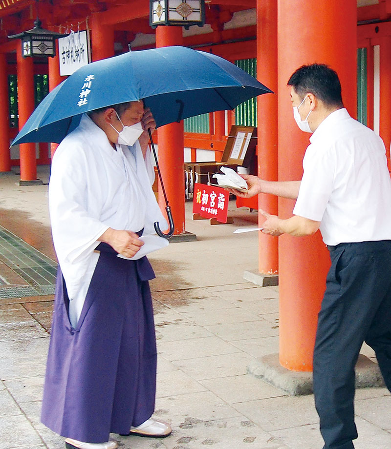 さいたま市内の和菓子店9店舗で作る「ついたちまんじゅうの会」(佐藤高広会長・藤宮製菓社長)は1日、同市大宮区の氷川神社に「ついたちまんじゅう」を奉納。その後、おはらいを受けたまんじゅうは、同神社の参拝者らにプレゼントされた。