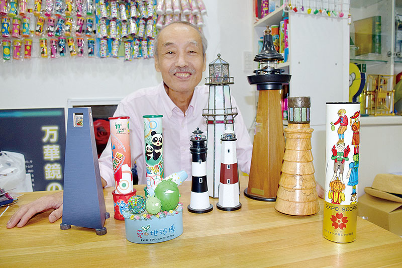川口市幸町2丁目の「日本万華鏡博物館」で19日まで、企画展「灯台と万国博覧会の万華鏡展」が開かれている。今回は灯台の形をしたアート作品の万華鏡と、各地の万博でお土産品として売られてきた万華鏡を特集した。灯台は船の安全を守る施設。万華鏡は光を遠くへ届けるための灯台の研究の中から生まれた副産物で、灯台とは深い縁があるようだ。