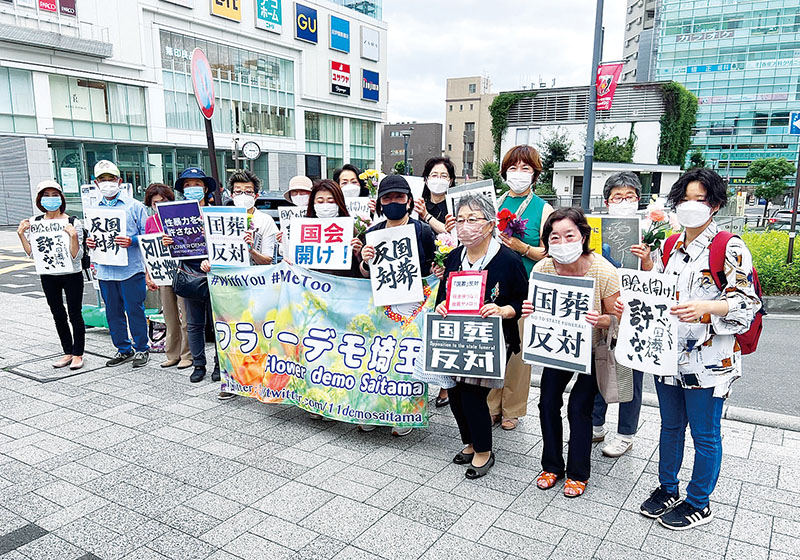 花を手に性暴力被害の根絶を訴える「フラワーデモ埼玉」が11日、JR浦和駅(埼玉県さいたま市)東口で行われた。参加者は「閣議決定だけで決めた国葬は法的根拠がない」として、今月27日に実施される安倍晋三元首相の「国葬」に反対を訴えた。