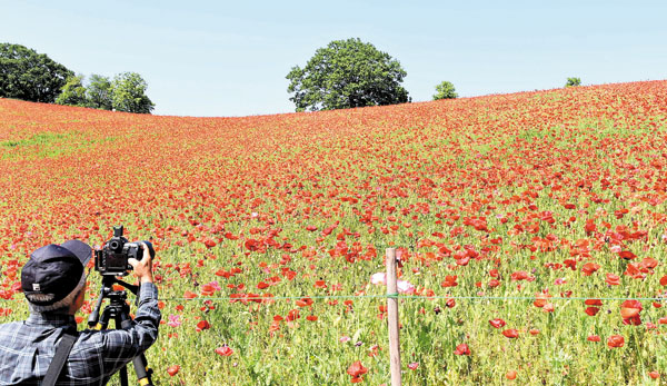 標高約500メートルの牧場で、約3ヘクタールの敷地面積に約1千万本のシャーレーポピーが咲き誇る。今年は天候不順の影響で種まきが2段階になり、先にまいた部分が現在は見頃を迎え、遅くまいた部分は6月上旬から見頃となる見込み。