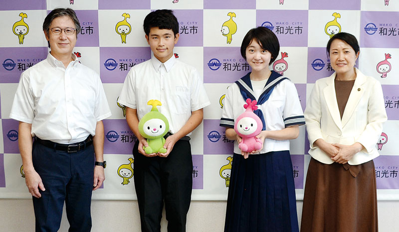 中学生らがアナウンスの発声や朗読の表現方法、テレビ番組の編集技術などを競う「第39回NHK杯全国中学校放送コンテスト」のアナウンス部門に出場し、優良賞を受賞した和光市立大和中学校(金子文春校長、生徒数821人)の3年生、秋野華加さん(15)と入選した同、吉岡大輝さん(14)が同市役所を表敬訪問し、柴崎光子市長らに受賞結果を報告した。