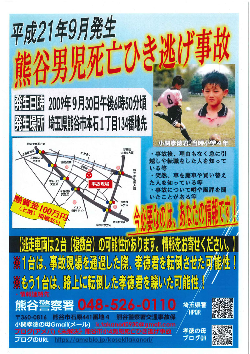 熊谷市で2009年9月、小学4年の小関孝徳君=当時(10)=が死亡した未解決のひき逃げ事件は、30日で発生から13年を迎える。県警は新たにチラシを作り直し、孝徳君の母親は今も犯人の逮捕に向けて全力を尽くしている。時効まであと7年。事件の風化に危機感を抱く母親は「死亡ひき逃げ事件の公訴時効を撤廃し、逃げることを考えない社会をつくってほしい」と訴える。