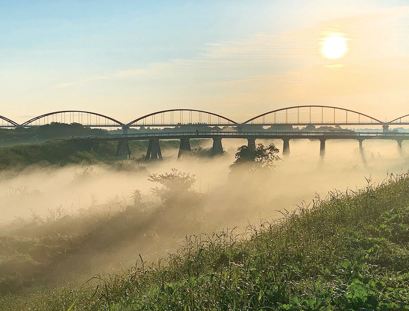 高気圧に覆われて、放射冷却により冷え込みが強まった6日の朝、鴻巣市荒川の大芦橋付近で幻想的な川霧が出現した。河川敷まで包み込んだ霧が、朝日に照らされて、まるで雲海のような幻想的な風景となった。