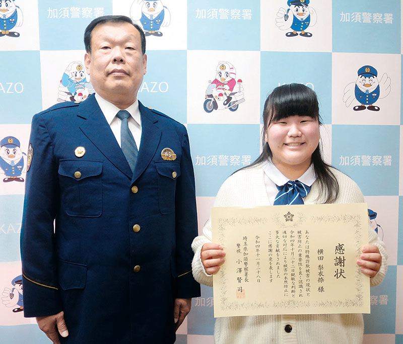 加須署(小沢賢司署長)は28日、特殊詐欺被害を未然防止した功労で、コンビニエンスストア・ファミリーマート豊野台テクノタウン店のアルバイト店員、県立羽生高校2年の横田梨衣捺(りいな)さん(17)に同署で感謝状を贈った。